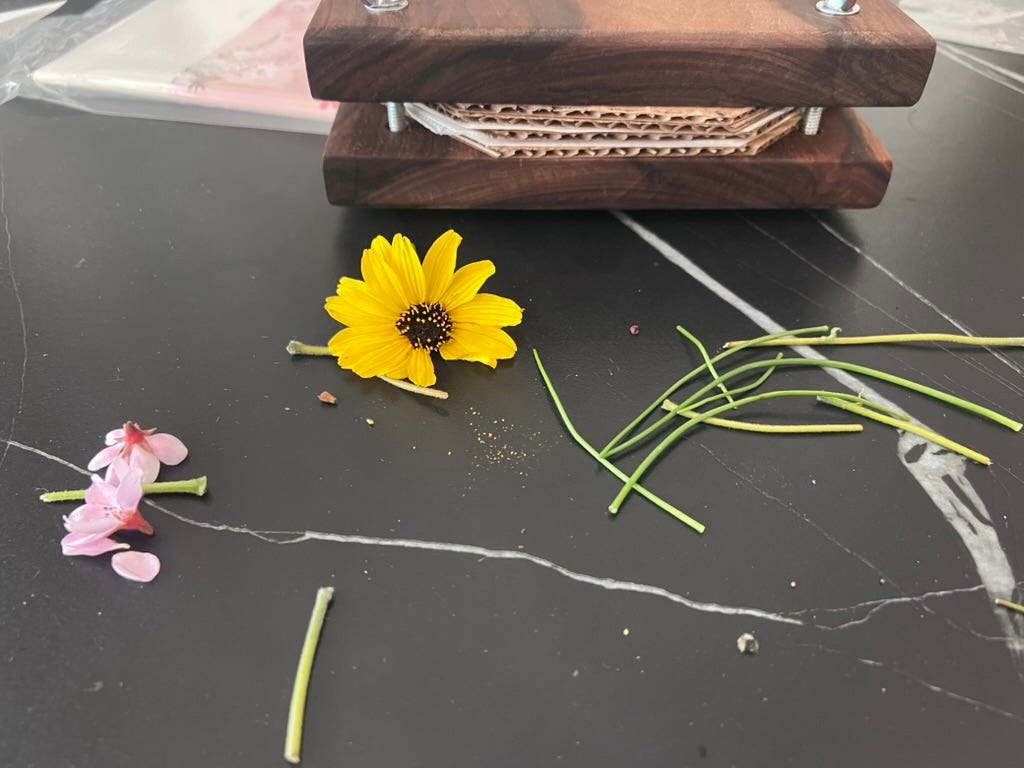 4. Pressing my first batch of flowers with the homemade press my dad made me! I forgot to take a more aesthetically pleasing photo before tightening the bolts oops